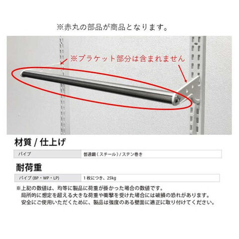 仕様2:・パーツ毎の注意: ※パイプセットのブラケットなし、パイプ本体のみの商品になります。 ※パイプセットとしてご使用になりたい場合は、別途ブラケットが必要になります。