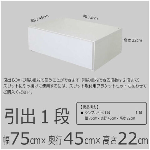 仕様1:・パーツ種類: 置型アイテム 引出BOX1段・パーツ種類の説明: 見せたくないものなどは引出へ収納すると便利です。 別売りのスリット取付用ブラケットセットを使用すれば、お好きな高さで、スリットに取り付けることも可能です。 また、引出BOX3段の上に重ねていただくこともできます。