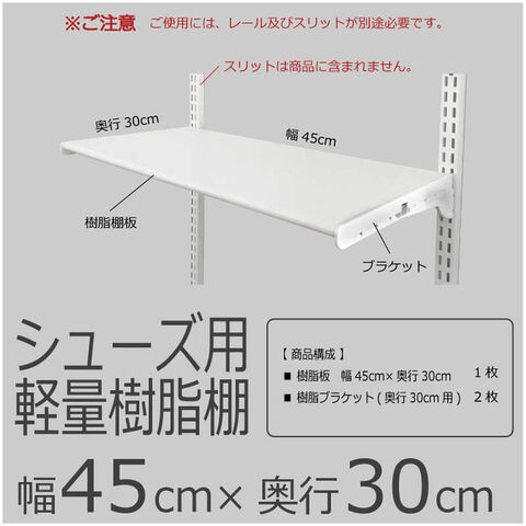 仕様3:・本体サイズ: W450×D300mm・耐荷重: 1枚につき3kg・カラー: 棚板色: ホワイト・梱包内容: 1.樹脂板 幅45cm×奥行30cm 1枚 2.樹脂ブラケット(奥行き30cm用) 2枚