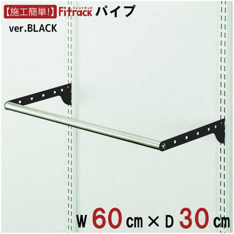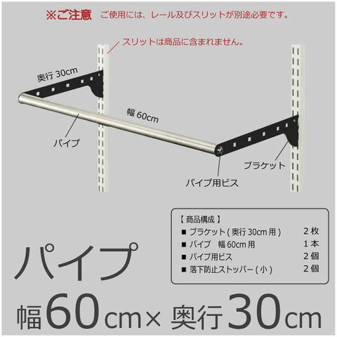 仕様3:・本体サイズ: W600×D300mm・製品重量: 0.94kg・耐荷重: 1セットにつき25kg・カラー: ブラケット: ブラック・仕様: 金属ブラケット仕様・梱包内容: 1.ブラケット(奥行き30cm用) 2枚 2.パイプ 幅60cm用 1本 3.パイプ用ビス 2個 4.落下防止ストッパー(小) 2個