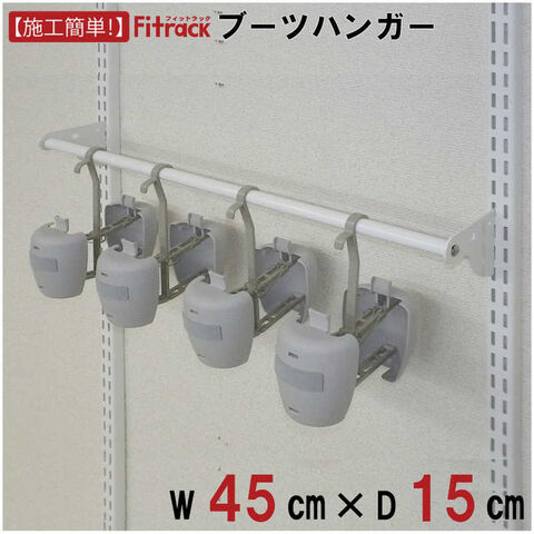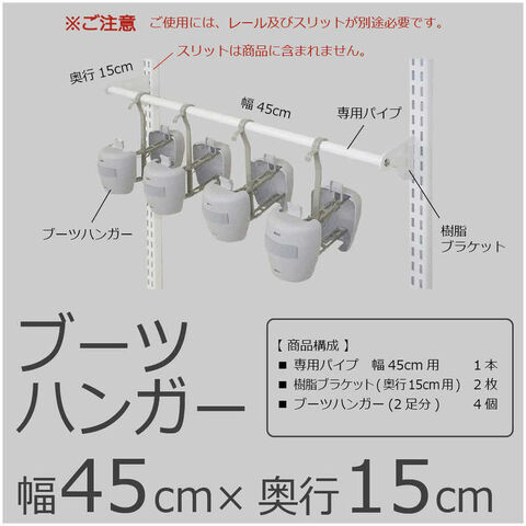 仕様3:・本体サイズ: W450×D150×H195mm・カラー: グレー・仕様: ブーツハンガー2足分(4個)付き、樹脂ブラケット仕様・梱包内容: 1.専用パイプ 幅45cm用 1本 2.樹脂ブラケット(奥行15cm用) 2枚 3.ブーツハンガー(2足分) 4個