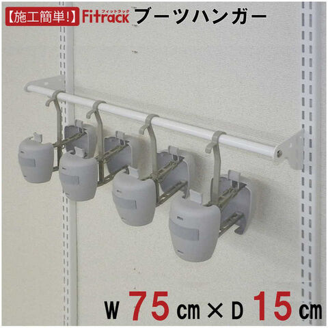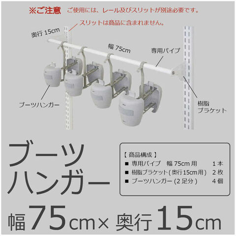仕様3:・本体サイズ: W750×D150×H195mm・カラー: グレー・仕様: ブーツハンガー2足分(4個)付き、樹脂ブラケット仕様・梱包内容: 1.専用パイプ 幅45cm用 1本 2.樹脂ブラケット(奥行15cm用) 2枚 3.ブーツハンガー(2足分) 4個