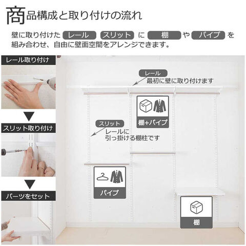 あとはパーツを組み立て、FKスリットへ引っ掛ければ収納の完成です!下地を新たに設けることができない場合もFKレールに穴あけ加工を行い、問柱に固定すれば 150kg の耐荷重が実現します。