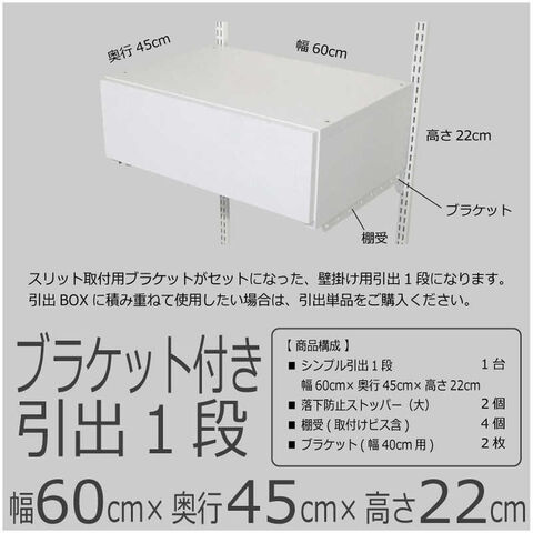 仕様3:・本体サイズ: W600×D450×H220mm・製品重量: 13kg・カラー: ホワイト・梱包内容: 1.引出1段 幅60cm×奥行45cm×高さ19.5cm 2.ブラケット 奥行き40cm用 2枚 3.棚受(ビス含) 4個 4.落下防止ストッパー小 2個