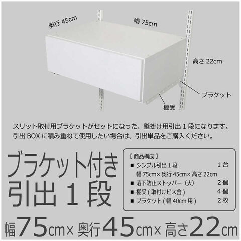 仕様3:・本体サイズ: W750×D450×H220mm・製品重量: 15kg・カラー: ホワイト・梱包内容: 1.引出1段 幅75cm×奥行45cm×高さ22cm 2.ブラケット 奥行き40cm用 2枚 3.棚受(ビス含) 4個 4.落下防止ストッパー小 2個