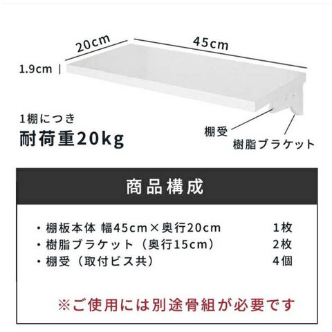 仕様1:・パーツ種類: TSセット(木棚セット)・パーツ種類の説明: 木棚の収納パーツです。奥行き・幅がお選びいただけます。ホワイト色で清潔感のある棚板なので、パントリーやちょっとした作業台などにピッタリです。