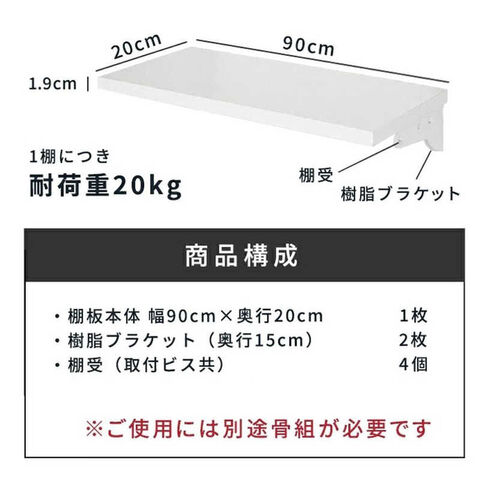 仕様1:・パーツ種類: TSセット(木棚セット)・パーツ種類の説明: 木棚の収納パーツです。奥行き・幅がお選びいただけます。ホワイト色で清潔感のある棚板なので、パントリーやちょっとした作業台などにピッタリです。