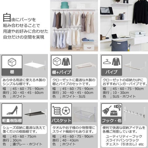 基本的な棚板はもちろんシューズ用の棚板、バスケット、引き出し、ハンガー等々、ライフスタイルに合わせて細かいニーズに応えるラインナップです。