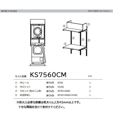 仕様2:■梱包内容:①FKレール W765 1本、②FKスリット H1202 3本、③乾太くん用棚板セット W750×D600 1セット④排湿筒隠し 1セット*取付ビスセット付き