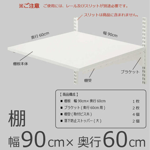 仕様3:■本体サイズ:W900×D600mm■耐荷重:1枚につき35kg■カラー:ホワイト■梱包内容:①棚板 幅90cm×奥行60cm 1枚②ブラケット(奥行き60cm用) 2枚③棚受(取付ビス共) 4個④落下防止ストッパー(大) 2個