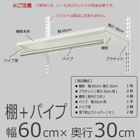 仕様3:■本体サイズ:W600×D300mm■耐荷重:1枚につき35kg(棚とパイプ合わせたトータル耐荷重となります。)■カラー:ホワイト■梱包内容:①棚板 幅60cm×奥行30cm 1枚②ブラケット(奥行き30cm用) 2枚③棚受(取付ビス共) 4個④パイプ 幅60cm用 1本⑤パイプ受け 2個⑥落下防止ストッパー(大) 2個