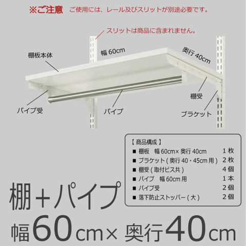 仕様3:■本体サイズ:W600×D400mm■耐荷重:1枚につき35kg(棚とパイプ合わせたトータル耐荷重となります。)■カラー:ホワイト■梱包内容:①棚板 幅60cm×奥行40cm 1枚②ブラケット(奥行き40・45cm用) 2枚③棚受(取付ビス共) 4個④パイプ 幅60cm用 1本⑤パイプ受け 2個⑥落下防止ストッパー(大) 2個