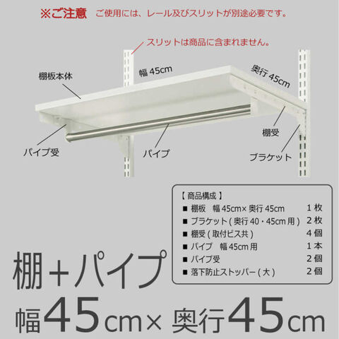 仕様3:■本体サイズ:W450×D450mm■耐荷重:1枚につき35kg(棚とパイプ合わせたトータル耐荷重となります。)■カラー:ホワイト■梱包内容:①棚板 幅45cm×奥行45cm 1枚②ブラケット(奥行き40・45cm用) 2枚③棚受(取付ビス共) 4個④パイプ 幅45cm用 1本⑤パイプ受け 2個⑥落下防止ストッパー(大) 2個