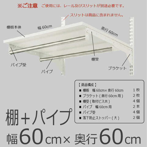 仕様3:■本体サイズ:W600×D600mm■耐荷重:1枚につき35kg(棚とパイプ合わせたトータル耐荷重となります。)■カラー:ホワイト■梱包内容:①棚板 幅60cm×奥行60cm 1枚②ブラケット(奥行き60cm用) 2枚③棚受(取付ビス共) 4個④パイプ 幅60cm用 2本⑤パイプ受け 4個⑥落下防止ストッパー(大) 2個