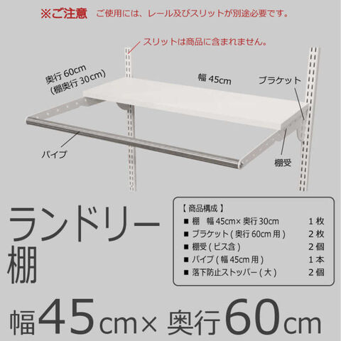 仕様1:■パーツ種類:ランドリー棚セット■パーツ種類の説明:浅めの棚とパイプが一体になっているランドリー棚セット。棚には洗濯かごや洗剤、パイプには洗濯物をかけられます。