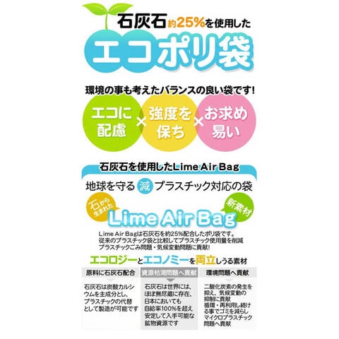 石灰石を約25%を使用し環境にやさしい手さげ付きエコポリ袋です。