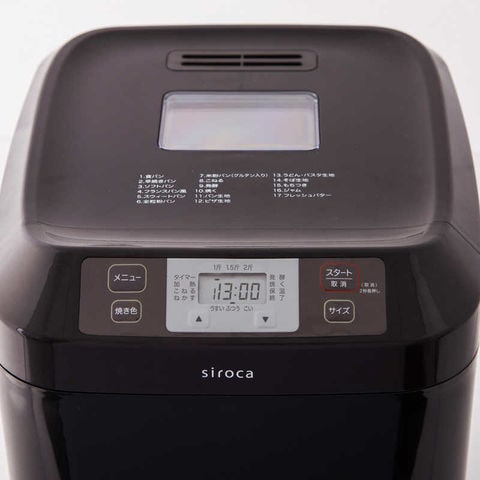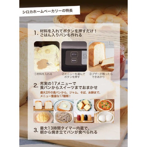 新しくなって、さらにおいしく。お蕎麦も作れるNewシロカベーカリー。自分好みの材料、発酵時間、焼き加減でオリジナルパンを作る…。美味しくできた時の喜び、うまくいかなかった時のちょっぴり悔しい気持ち、どちらも手づくりの良さであり、楽しさだ。そんな手づくりパンが、簡単手軽に楽しめる「sirocaホームベーカリー」が、さらに美味しく、からだにやさしいNewメニューも搭載してリニューアル。おいしい焼きたてパンの香りで目覚めるしあわせ、たっぷりご堪能あれ。*パン・お餅・そばなど充実の17メニュー搭載!*届いたその日から楽しめるオリジナルレシピブック付き*最大2斤対応!1斤・1.5斤・2斤の食パンが焼ける*タイマー付き!朝から焼き立てパン♪