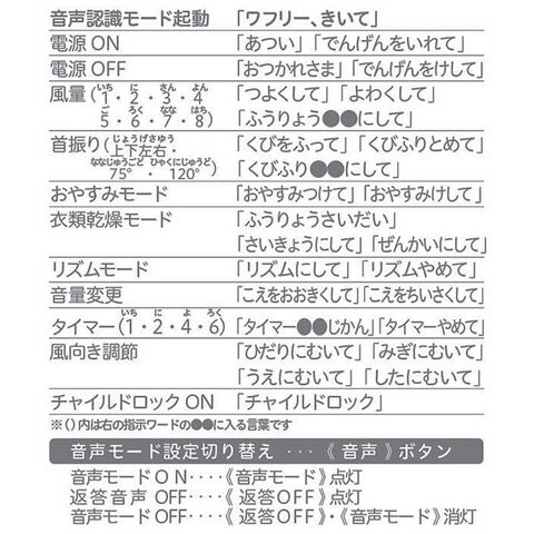 電源のON/OFF・風量の調節・首振り運転・送風モード・タイマー・風向の調節・音声モードの音量・チャイルドロックONが音声で操作できます!