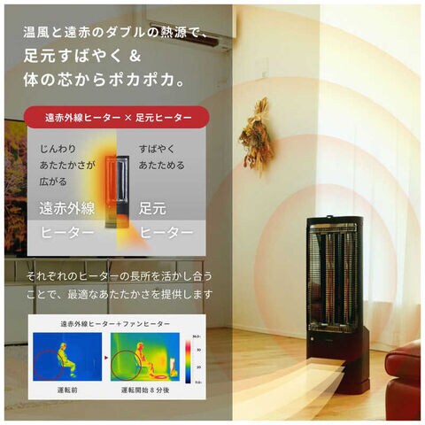 立ち上がりの速い足元ヒーター(ファンヒーター)と、じんわりあたたまり、あたたかさが持続する遠赤外線ヒーターの2つを搭載。