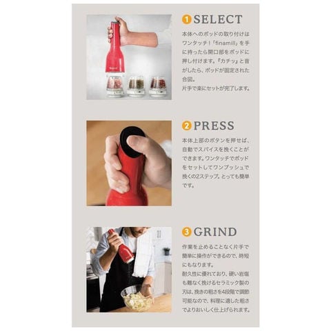 片手でOK/片手プッシュで挽ける自動グラインダーなのでフライパンで片手で塩・胡椒を振りかけるなど調理しながらラクラク調理ができます。(力は要りません)
