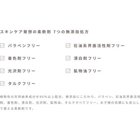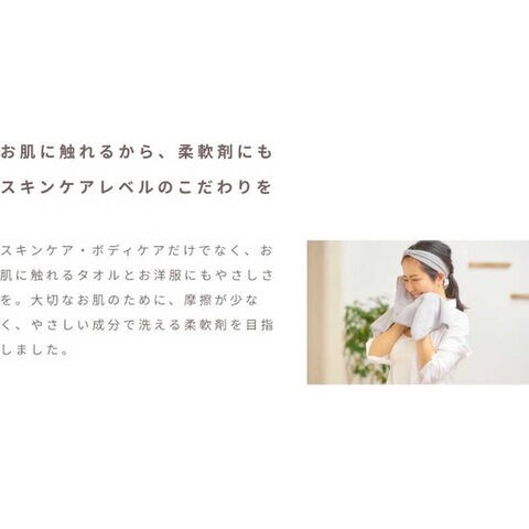 大切なお肌のためにつくった、天然由来の柔軟成分配合の柔軟剤。コットンのような肌ざわりのよい仕上がりで、ふんわりやさしく肌を包みます。
