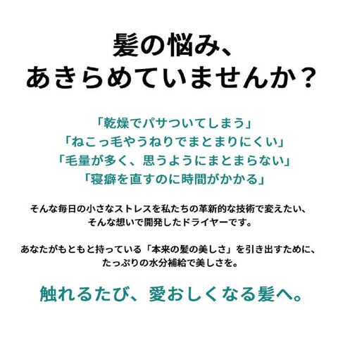 そんな毎日の小さなストレスを私たちの革新的な技術で変えたい、そんな想いで開発したドライヤーです。
