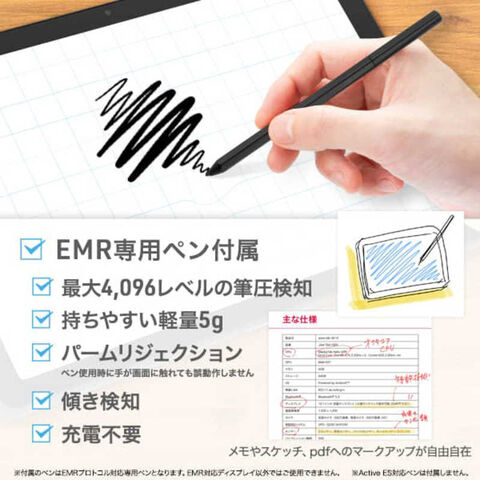 本体には充電不要の専用EMRペンが付属しており、筆圧感知や傾き検知はもちろん、パームリジェクション機能も完備。
