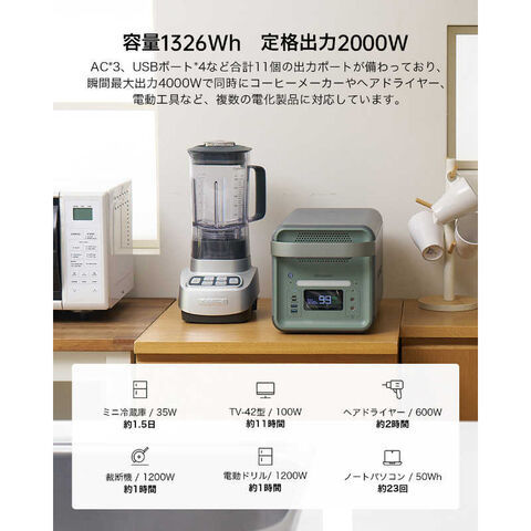 ●1326Whの大容量で、定格出力2000W、最大4000Wと高出力。11個の出力ポートで複数のデバイスに同時給電が可能。多数の安全認証を取得し、UPS機能も搭載。