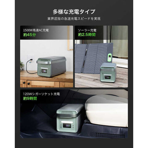●AC、シガーソケット、ソーラー充電と多様な充電方法。高速充電に対応しており、45分で80%まで高速充電。