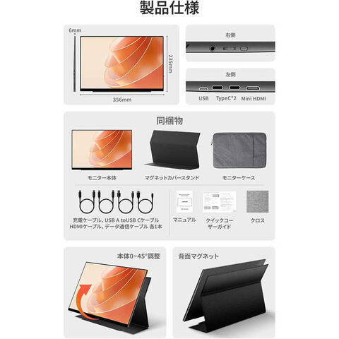 付属品:モニターケース、カバースタンド、HDMIケーブル、データ通信ケーブル、電源ケーブル、USB A toUSB Cケーブル、電源アダプター