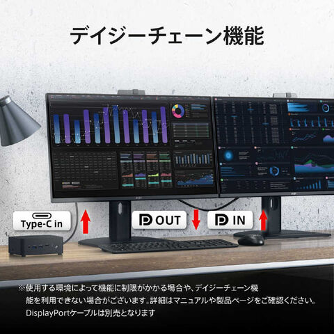 仕様2:Adaptive-SyncEye-Q CheckHDRGセンサーProductivity IntelligencePIP / PBP※1 デイジーチェーンを使用するには1台目のモニターとPC本体間の接続はUSB Type-C(DP Alt mode)端子で接続し2台目のモニターとDisplayportケーブル(別売)で接続する必要がありますなお、Mac製品をお使いの場合、デイジーチェーン機能が利用できません