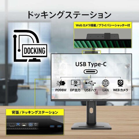 入出力端子:HDMI 2.0b ×2、DisplayPort 1.2a 入力 ×1、DisplayPort 1.2a 出力 ×1、USB Type-C(DP Alt mode、USB PD) ×1、USB 3.2 Gen1 Type-A(USBハブ) ×4、USB 3.2 Gen1 Type-B(PC接続用) ×1、有線LANポート(10 / 100 / 1000Mbps) ×1、ヘッドホン出力 ×1
