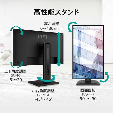 高さ調節機能:[上下角度調節(チルト)]-5° ~ 20°[高さ調整]0 ~ 130mm[左右角度調整(スイベル)]-45° ~ 45°[画面回転機能(ピボット)]-90° ~ 90°