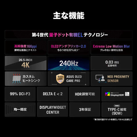 仕様2:[FEATURES] GamePlus Game Visual VRR Technology:FreeSync Premium Pro & G-SYNC Compatible Extreme Low Motion Blur DisplayWidget:DisplayWidget Center Shadow Boost Aspect Control[電圧]100-240V、50/60Hz[ライティング機能]Aura Sync[Proximity Sensor]Neo Proximity Sensor