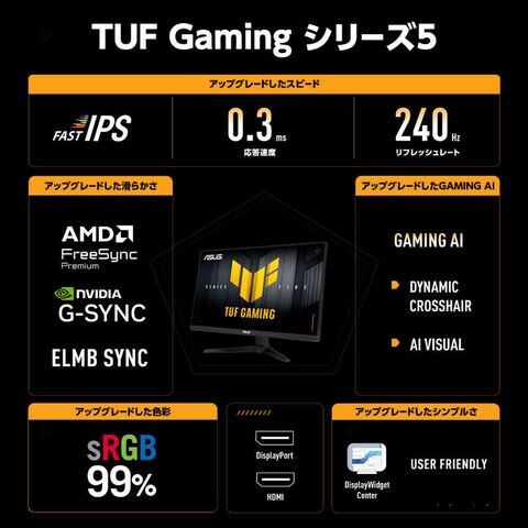 TUF Gaming シリーズ 5 - VG249QM5A ゲーミングモニター 23.8インチ フルHD Fast-IPSパネル、240Hz、0.3ms、G-SYNC 対応、AMD FreeSync Premium、ELMB SYNC、99% sRGB、DisplayWidget Center、Gaming AI