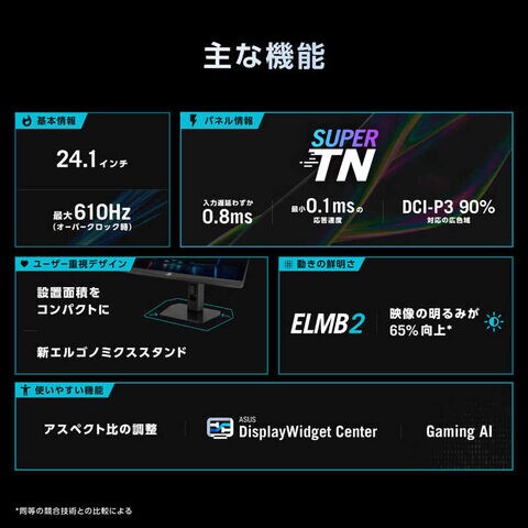 ●24.1インチのフルHD Super TNパネルに、最大610Hzのリフレッシュレートを搭載。プロeスポーツプレイヤーのために設計された高性能モデル。