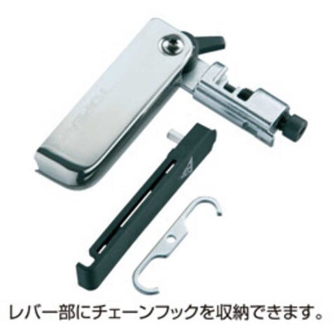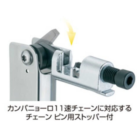 美しいステンレス ボディの小型収納ケースに、チェーンフックまでを備えた11速対応のチェーンツール。