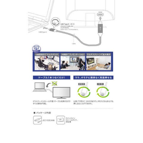仕様1:[コネクター]HDMI(オス)[ホスト(パソコンと接続側)]USB Type-C(オス)[最大解像度]4K 3840 x 2160 @60H[材質]アルミニウム[ケーブル長さ]1.8m[パッケージ内容]JCC153G本体、クイックインストールガイド、保証書[対応OS]Windows、Mac 、Chrome※USB Type-Cを備えるホスト側がDisplayPort Alternate modeに対応している必要があります。