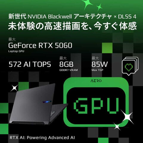 グラフィック:NVIDIA GeForce RTX 5060 Laptop GPU 8GB GDDR7最大 Graphics Power 85W