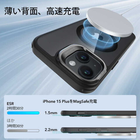(対応機種)iPhone 15 Plus専用です。カメラレンズフィルムや内蔵カメラレンズフィルムは含まれません。(より強力な磁気吸着)1,500 gの吸着力を持つ強力な内蔵磁石により、素早く簡単にワンタッチでワイヤレス充電が可能で、MagSafeアクセサリーを確実に吸着します。(調節可能な隠れスタンド)折りたたんだときにカメラのフレームに隠れるように配置され、MagSafeリングを100%妨げず、いつでもどこでも自由に調整でき、安定した角度で動画を視聴できます。(長持ち設計)頑丈で耐久性のある亜鉛合金により、いつでも新品のような輝きを維持。ヒンジは3,000 回以上の使用後も強度が維持されること実験済み。(米軍MIL規格の保護)衝撃吸収エアガードコーナーと隆起したスクリーンエッジ、カメラガードの組み合わせにより、落下、衝突、傷から保護します。