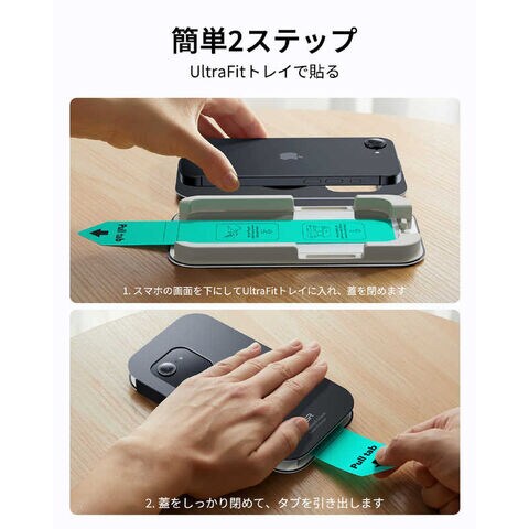 iPhone 16e ガラスフィルムスクリーン保護フィルムの専用貼り付けツールであるUltraFitトレイとクリーニングキットが付属しており、気泡のない素早い保護フィルム貼付けが行えます。
