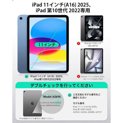対応機種:[対応機種]iPad A16 (11インチ、2025モデル)、iPad 第10世代 (10.9インチ、2022モデル)[モデル番号]A3354、A3355、A2696、A2757