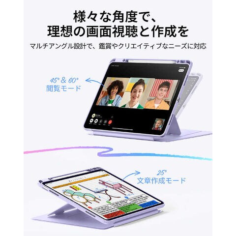 2つのスタンドモードに対応しており、45°~60°はビデオ鑑賞、作業、FaceTimingなどに最適なビューイングモードへと、25°に調節した場合は執筆、絵画、その他のクリエイティブな作業に最適なライティングモードへと用途に合わせて角度調節が行えます