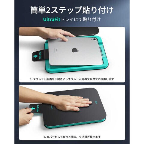 付属UltraFitトレイが正確な位置合わせを可能にし、ホコリ除去、静電吸着技術により、気泡・ホコリ混入のない簡単な取り付けがたったの数秒で行えます。
