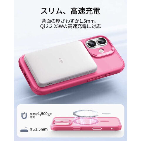 業界トップクラスの強力磁力(1500gの保持力)を内蔵した iPhoneケースです!MagSafeワイヤレス充電器やアクセサリーが瞬時に「ピタッ」と吸着するため、満員電車や急いでいる時でも位置調整の手間が不要です。
