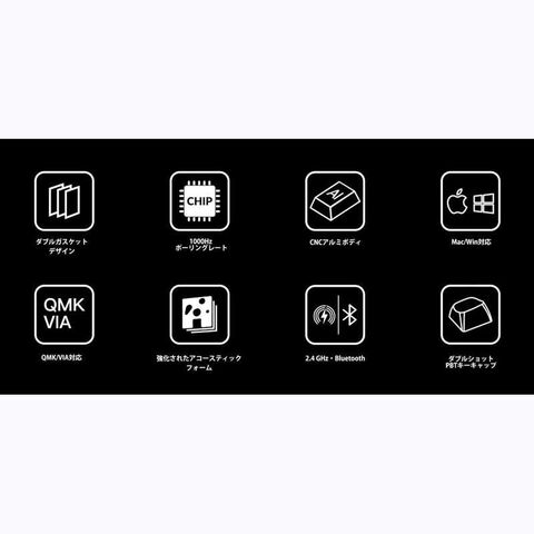 仕様2:[接続]USB TYPE-C、Bluetooth、2.4GHz[ポーリングレート]1000 Hz (2.4 GHz及びTYPE-C有線) / 90 Hz (Bluetooth)[MCU]ARM Cortex-M4 32-bit STM32F402 (256KB Flash)[ワイヤレス時連続使用]最大180時間(バックライトオフ時)[ワイヤレス時連続使用]最大100時間(RGB最小輝度時)[Nキーロールオーバー(NKRO)]無線・有線ともに対応