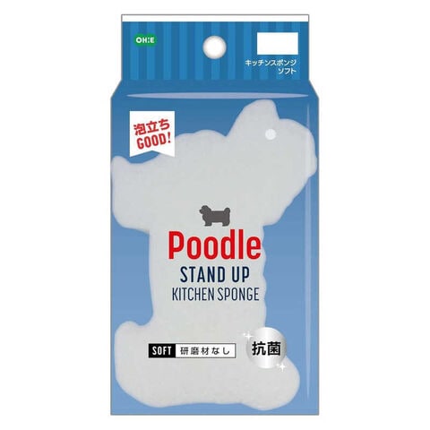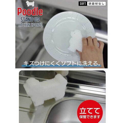 プードルの形のスポンジは立てて保管できてかわいくて実用的!不織布に研磨剤を含んでいないのでソフトにしっかり洗えます。