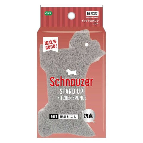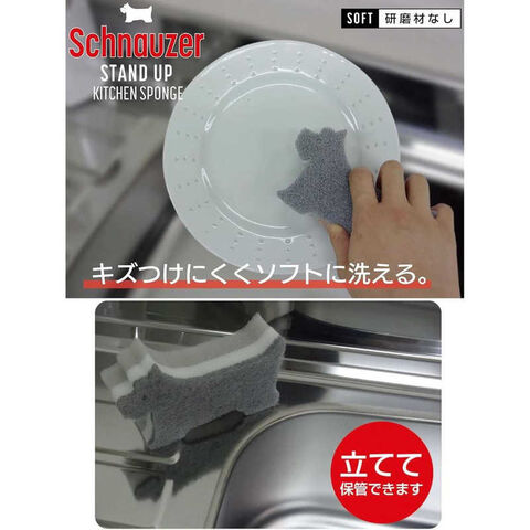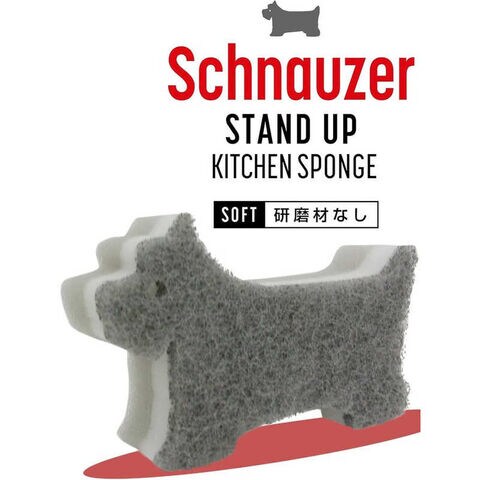 シュナウザーの形のスポンジは立てて保管できてかわいくて実用的!不織布に研磨剤を含んでいないのでソフトにしっかり洗えます。