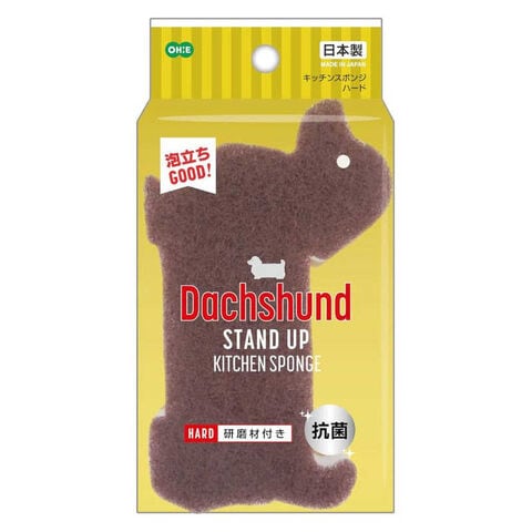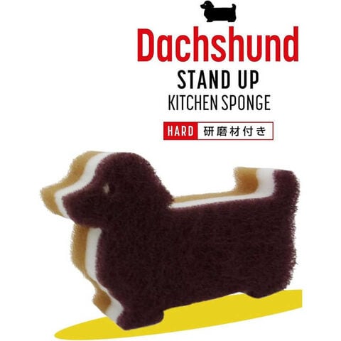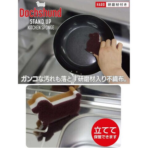ダックスフンドの形のスポンジは立てて保管できてかわいくて実用的!不織布に研磨剤を含んでいて、ガンコな汚れも落とします。