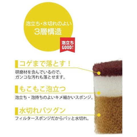 泡立ち・水切れのよい3層構造でスポンジ部分に抗菌加工が施されています。